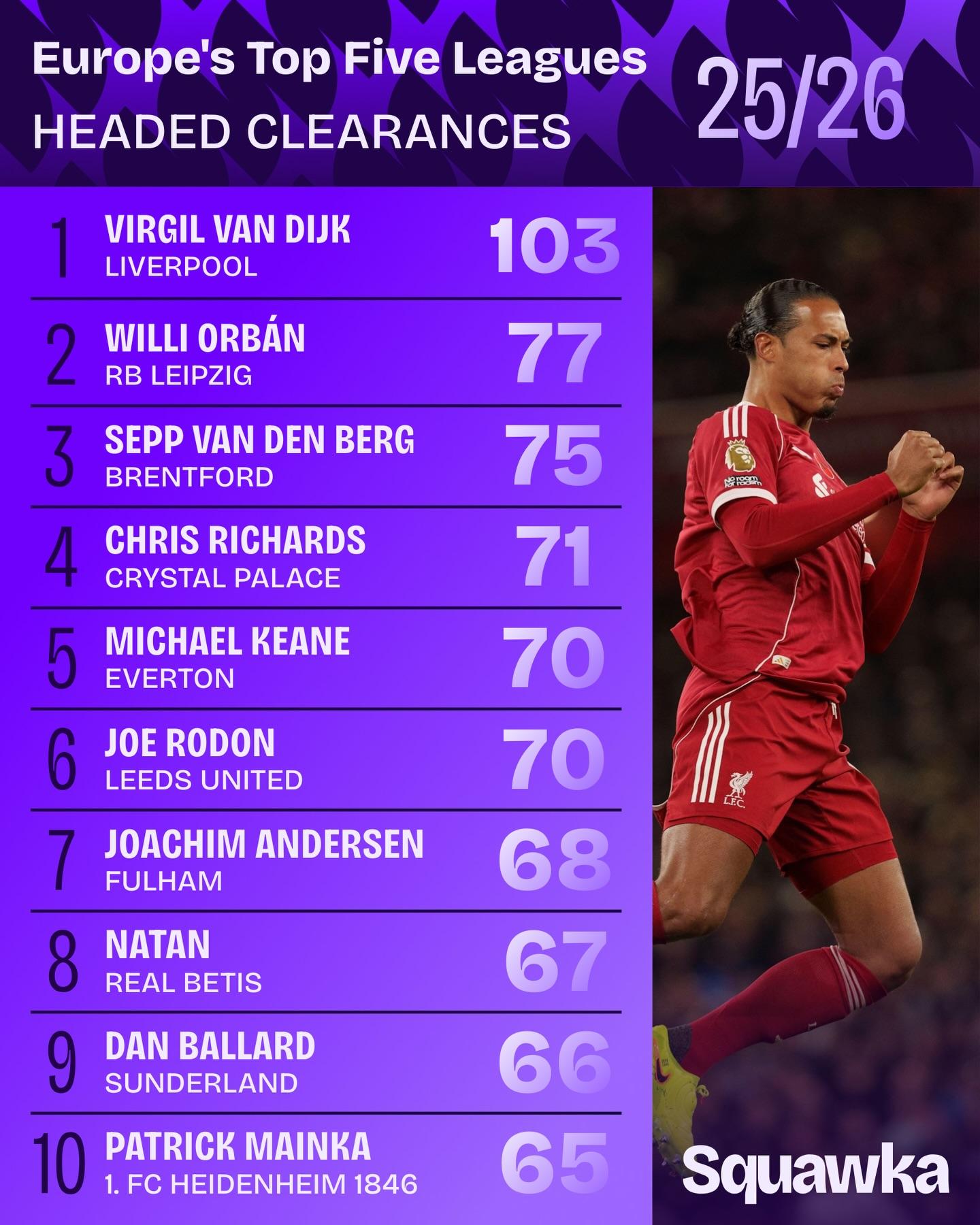 Squawka數據統計,解圍范戴克成為了本賽季至今歐洲五大聯賽中首位完成100次頭球解圍的范戴球員(103次),比其他任何球員都多出26次??吮?/p>來源:X