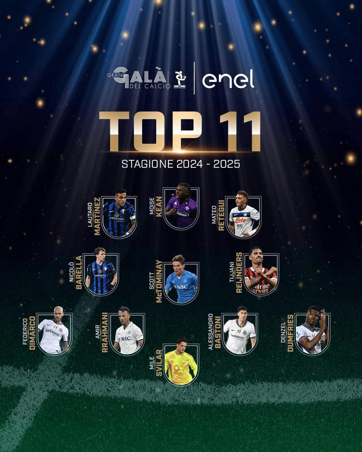 虎撲12月02日訊 在 2025 年的意大利年度最佳大獎(Gran Galà del Calcio)頒獎典禮上,意大利球員協會(AIC)公布了2024/25賽季意甲最佳陣容。意大員協