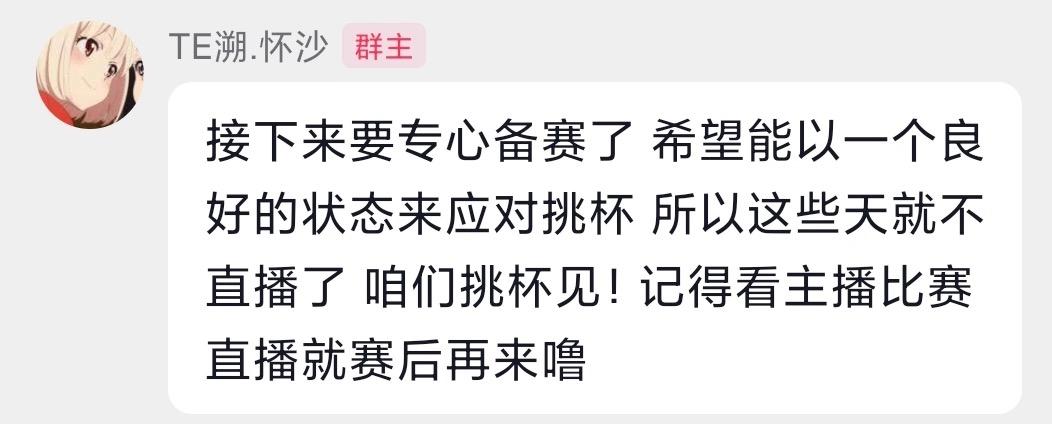 虎撲12月05日訊 TE溯懷沙發(fā)文:專心備賽這些天就不直播了,咱們挑杯見!專心直播咱們