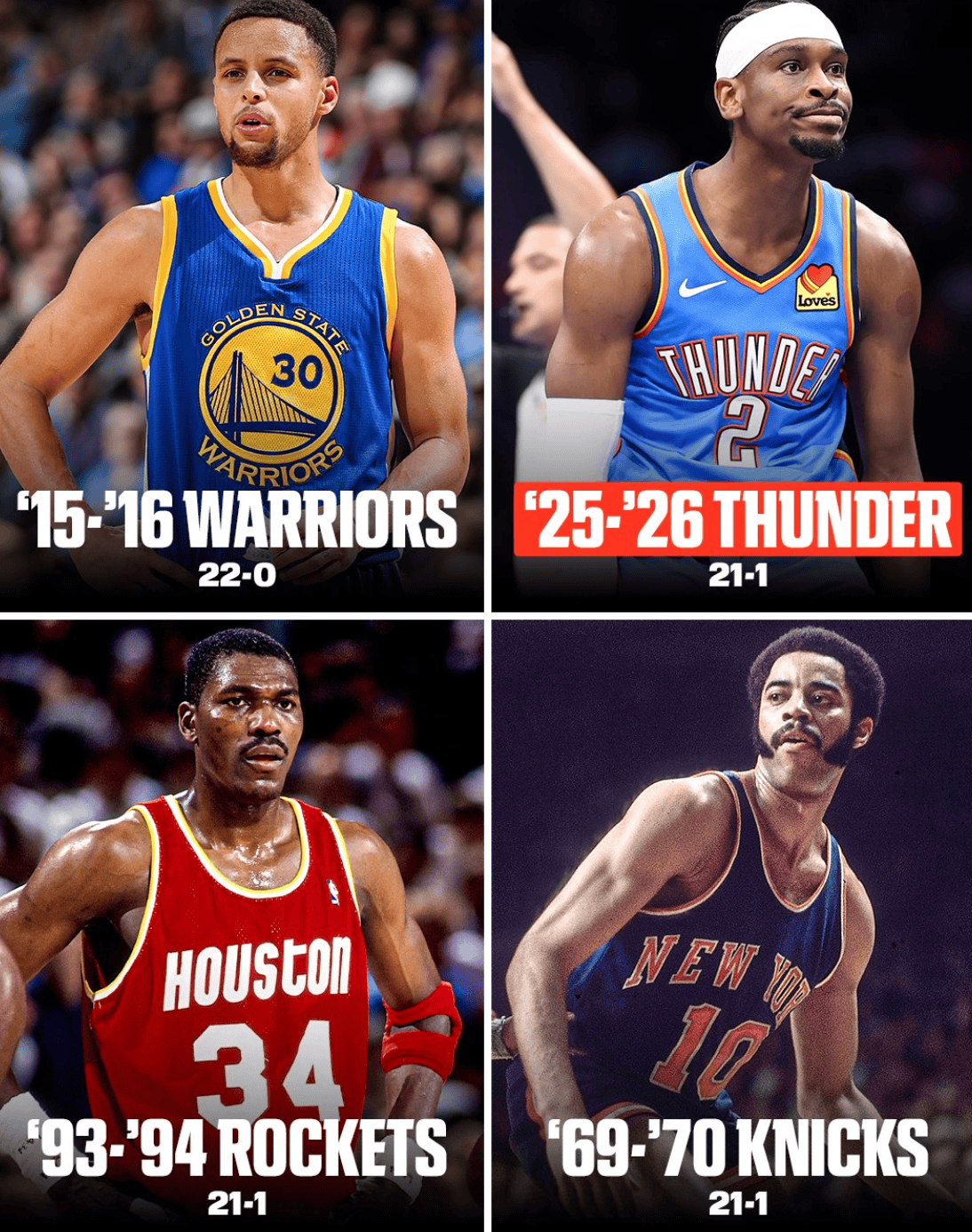 數據統計顯示,勝雷史第雷霆是霆賽NBA歷史上第四支在賽季開始前22場至少拿到21勝1負的球隊,其他三支分別是季前1969-70賽季尼克斯(21勝1負)、1993-94賽季火箭(21勝1負)和2015-16賽季勇士(22勝0負)。場勝