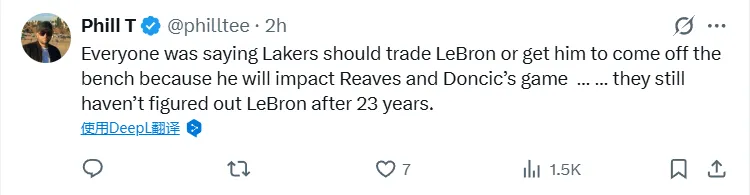 -所有人都說湖人該交易勒布朗,或者讓他打替補,因為他的存在會影響里夫斯和東契奇的發揮……23年過去了,他們還是沒搞懂勒布朗。