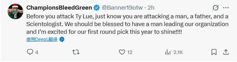 -(12贊)在批評泰倫·盧之前,請記住你攻擊的是一位丈夫、一位父親,更是一位科學教徒。能有這樣的人領導我們的球隊是我們的福氣,我期待今年首輪新秀大放異彩!!!!