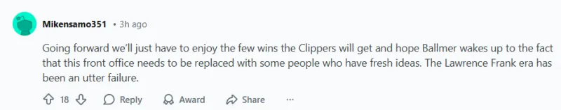 -(18贊)今后,我們只能享受快船為數不多的勝利,希望鮑爾默能清醒地認識到,這個球隊高層需要換成一些有新想法的人。勞倫斯-弗蘭克時代已經徹底失敗了。