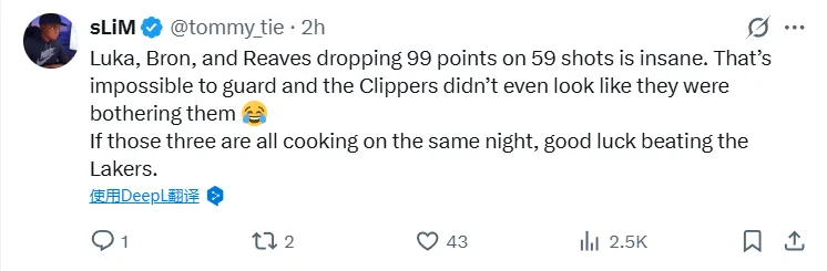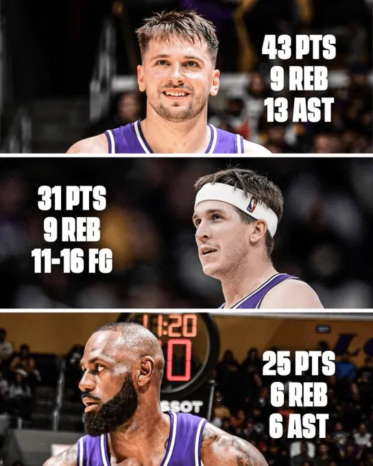 -(43贊)盧卡、勒布朗和里夫斯合砍99分,出手59次,簡直瘋狂。這種火力根本防不住,快船看起來甚至沒打算給他們制造麻煩。