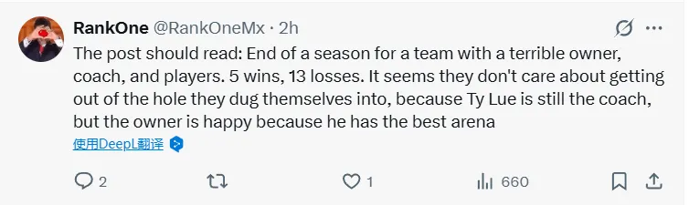 -該帖應為:一支擁有糟糕老板、教練和球員的球隊賽季終結。5勝13負。他們似乎無意擺脫自掘的困境。泰倫·盧依然執掌帥印,但老板卻心滿意足,畢竟他擁有最棒的球館。