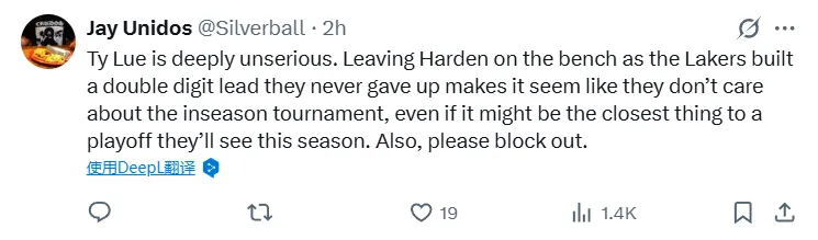 -(19贊)泰倫·盧實在太不認真了。當湖人建立起兩位數的領先優勢且始終保持領先時,他竟讓哈登坐在板凳上,這讓人感覺他們根本不在乎季中錦標賽,即便這可能是他們本賽季最接近季后賽的體驗。另外,請屏蔽!