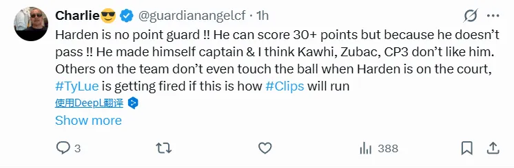 -哈登根本不是控衛??!他能砍下30+,但就是不傳球??!他自封隊長,我覺得卡哇伊、祖巴茨、CP3都不待見他。當哈登在場時,其他隊友甚至碰不到球,泰倫·盧要是讓快船這么打下去,遲早被炒魷魚。