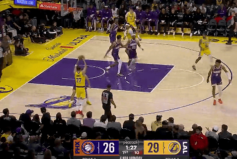 NBA常規賽,湖人對陣太陽的砍下比賽正在進行中。