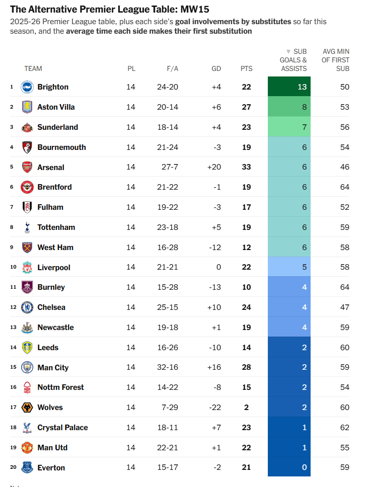 虎撲12月05日訊 The Athletic UK本周的數(shù)據(jù)分析專欄,聚焦于英超20隊(duì)的替補(bǔ)問題。