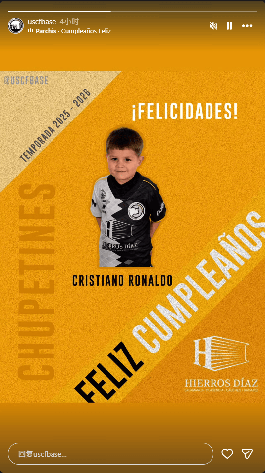 虎撲11月26日訊 西協甲球隊薩拉曼卡聯合(Unionistas)日前在青訓官方社媒發布限時動態,為梯隊中一名叫 克里斯蒂亞諾·羅納爾多(Cristiano Ronaldo) 的日名小球員慶祝生日。