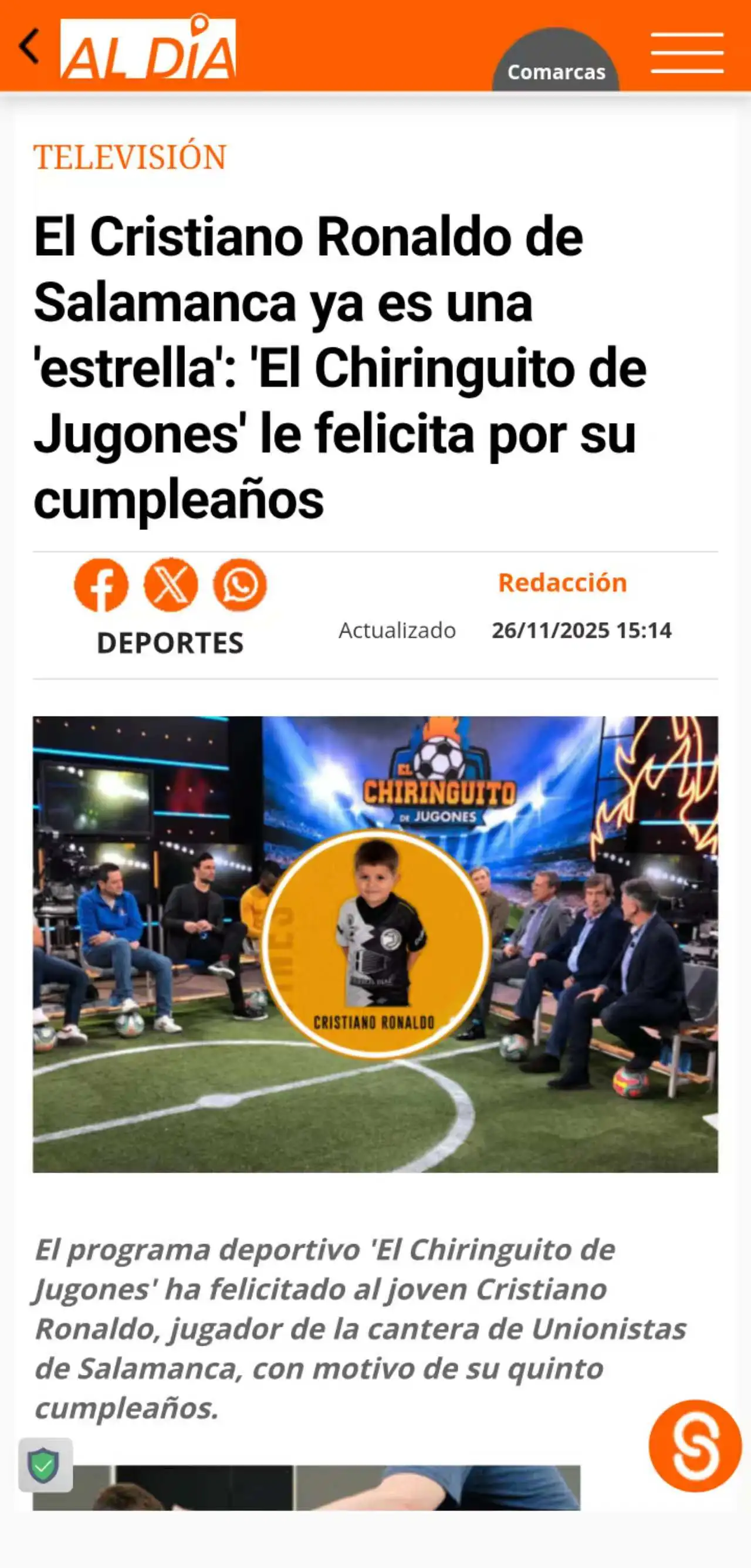 這一趣聞迅速引起了知名足球節目《西班牙六臺》(El Chiringuito)的字引關注,節目組在直播中專門為這位“小C羅”送上了祝福,此事也隨即引發了薩拉曼卡當地媒體的熱議。