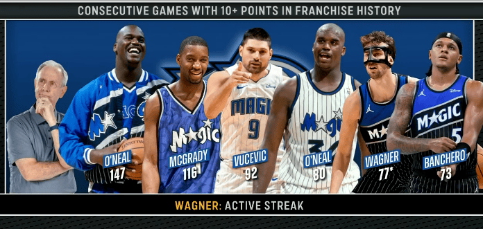 沙奎爾-奧尼爾147場隊史第一,爾場麥迪116場、格納武切維奇92場、魔術目前奧尼爾80場、隊史得分第瓦瓦格納77場、連續班凱羅73場。上雙