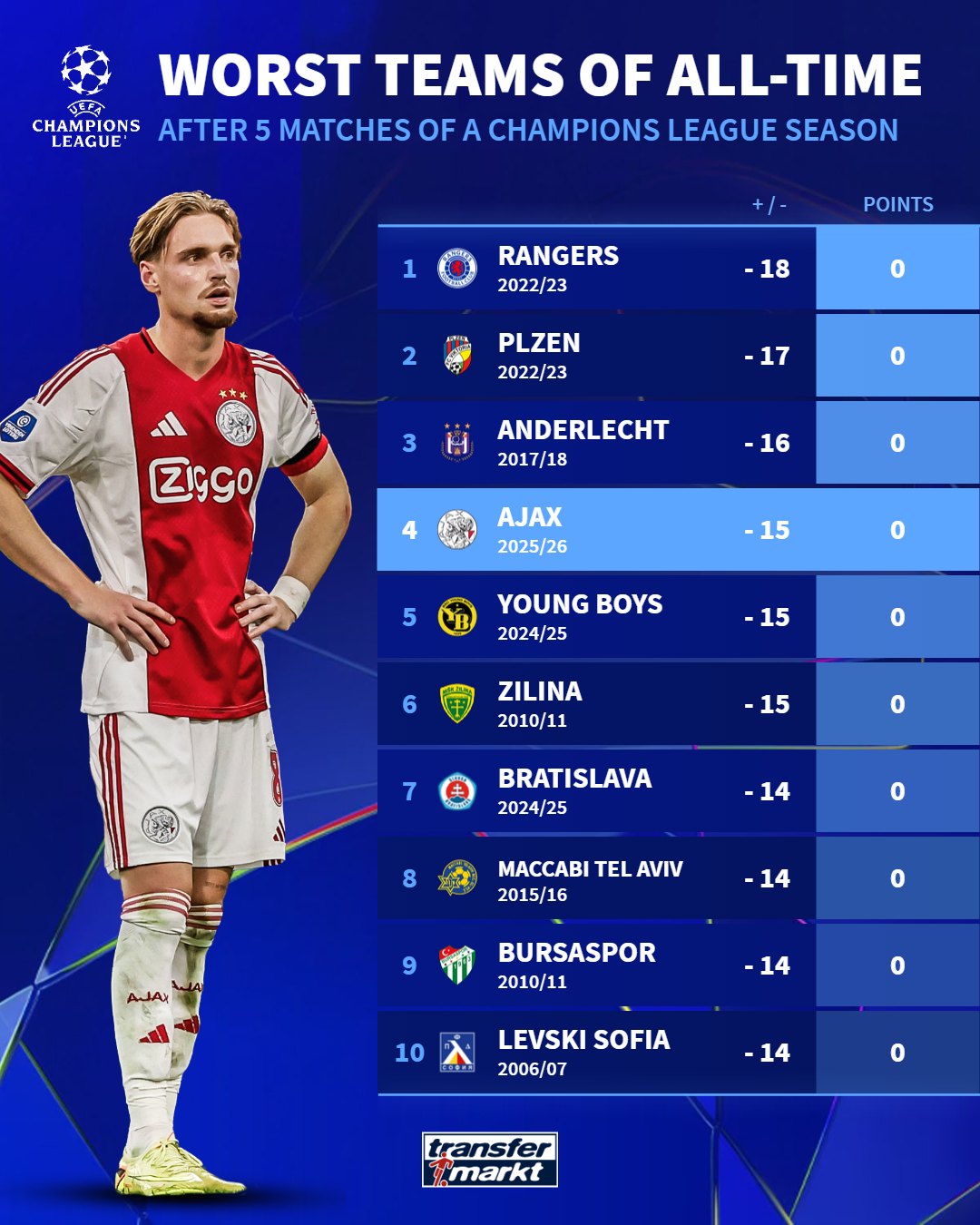 阿賈克斯(25/26賽季):-15,板德本賽0分