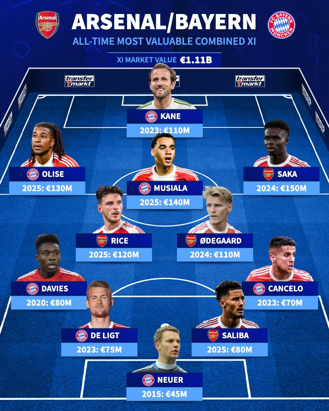 虎撲11月26日訊 本輪歐冠,阿森納主場對陣拜仁。凱恩賽前德轉盤點兩隊合體歷史身價最高陣容。奧利