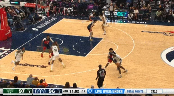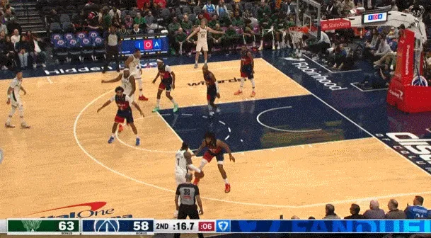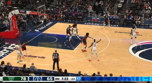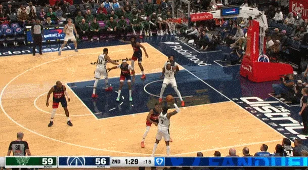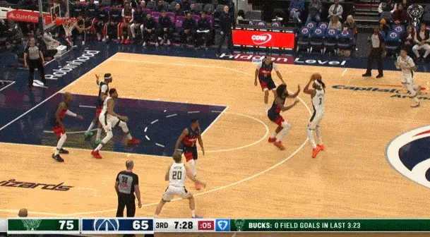 ——剩下2分鐘前,雄鹿落后6分,隨后也是小波特,持球突破吸引了三人包夾,然后傳球底角的AJ格林三分命中