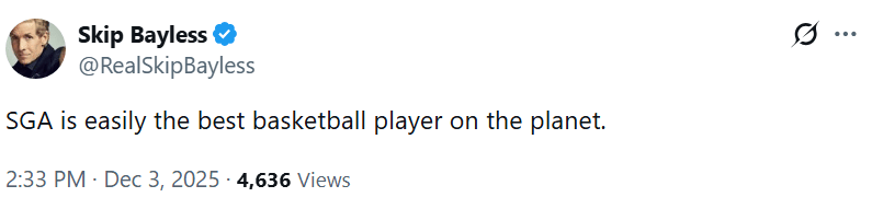 賽后,美國知名體育評論員Skip Bayless更推,稱贊了雷霆后衛謝伊-吉爾杰斯-亞歷山大的發揮: