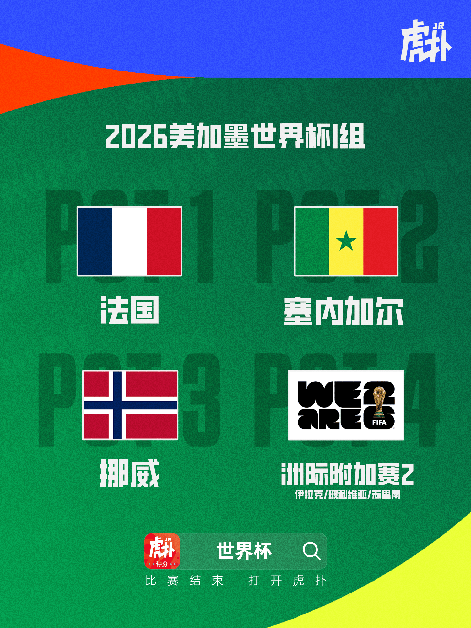 虎撲12月06日訊 2026美加墨世界杯分組抽簽儀式在華盛頓進行。I組的法國附加4支球隊為法國、塞內加爾、塞內賽勝挪威、挪威洲際附加賽球隊。板世