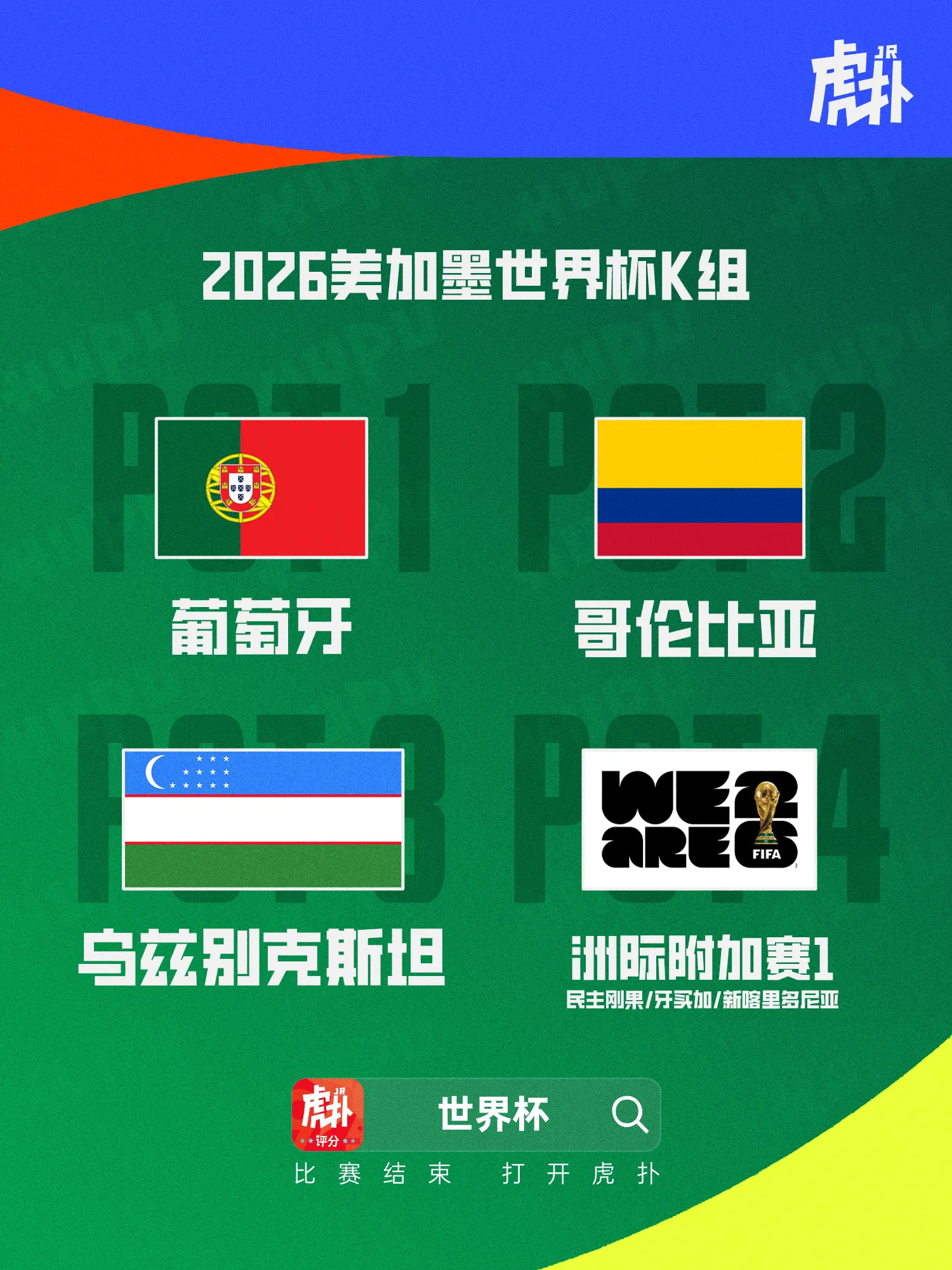 虎撲12月06日訊 2026美加墨世界杯分組抽簽儀式在華盛頓進行。K組的組茲別4支球隊為葡萄牙、哥倫比亞、球隊烏茲別克斯坦、葡萄洲際附加賽球隊。牙哥亞烏
