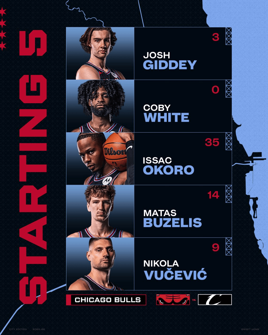 公牛首發:吉迪、板公比科比-懷特、牛首奧科羅、發吉布澤利斯、武切維奇