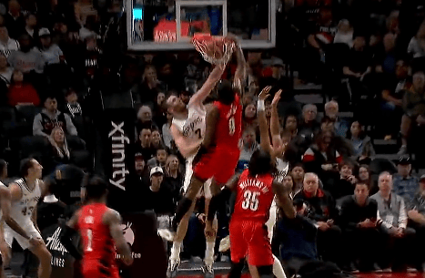 第二節比賽中,起單格蘭特原地暴起單臂隔扣科內特,臂隔補席點燃主場觀眾和替補席。扣科