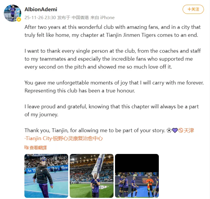 虎撲11月26日訊 今天晚上,天津津門虎外援阿代米在個人社交媒體上發文,告別球隊。