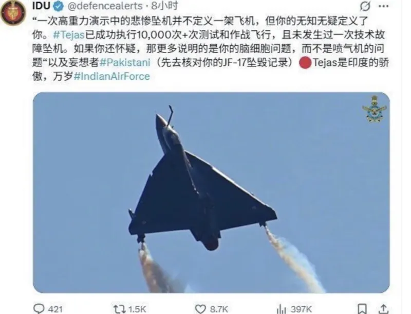 印度:“一次摔飛機不能定義一架飛機,你的無知定義了你,如果你懷疑光輝戰斗機,那是你的腦細胞問題,光輝是印度的驕傲!” 太Jai了!