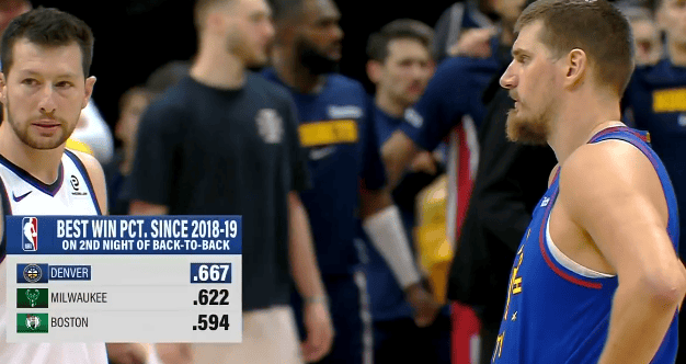 第一節比賽中,季背掘金轉播方列出數據,靠背自2018-19賽季以來,第場第雄背靠背第二場比賽勝率;