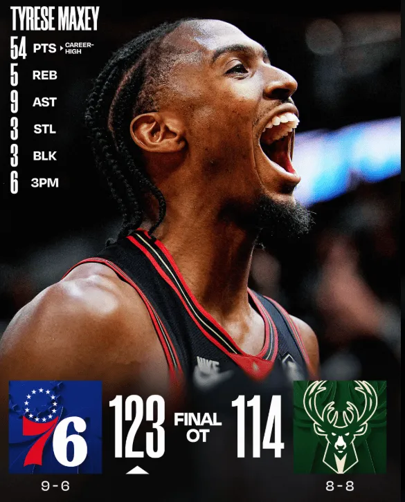 NBA官推發文稱:泰雷斯-馬克西砍下生涯新高的54分,成為自1973-74賽季以來第7位單場得到50分、3搶斷和3蓋帽的球員,帶領費城76人隊通過加時賽獲勝!