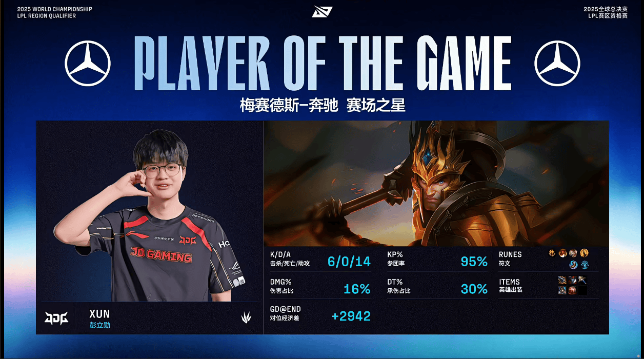 虎撲09月26日訊 在剛剛結束的JDG對陣WBG的BO5比賽中,Xun使用皇子打出6/0/14戰績,出戰斬獲JDG對陣WBG第一局MVP