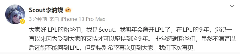 大家好,告別LPL的粉絲們,我是Scout。我明年會離開LPL了,在LPL的9年,覺得一直以來因為受到大家的支持才可以堅持到這9年。 非常感謝粉絲們,雖然不清楚以后還能不能回到LPL,但是特別希望再次見到大家。我們下次再見。 ???