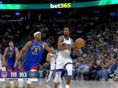 第四節(jié)比賽中,打成的國蒙克反擊快攻打成2+1,連敗8連敗的王還國王還剩6分鐘領(lǐng)先掘金8分。